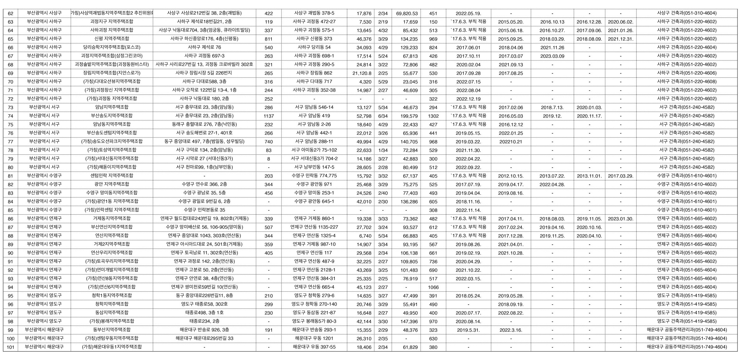 부산 사상구(6개): 사상 지역주택조합(사용검사), 감전동지역주택조합 추진위원회, (가칭)감전동 지역주택조합 추진위원회, (가칭)부산삼락 지역주택조합추진위원회 , (가칭)사상역괘법동 지역주택조합추진위원회, (가칭)사상역괘법동 지역주택조합2추진위원회